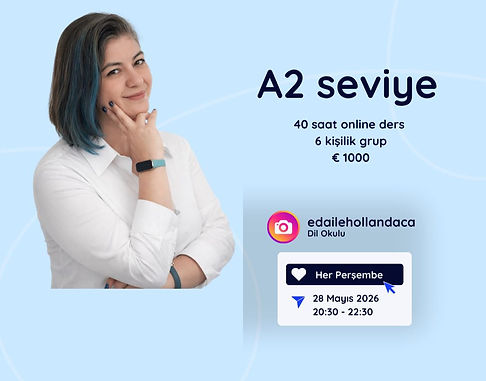 A2 Kursumuzda Pazartesi günleri 20:30-22:30 saatlari arasında haftada 2 saat ders yaparak De Opmaat kitabını bitireceğiz.